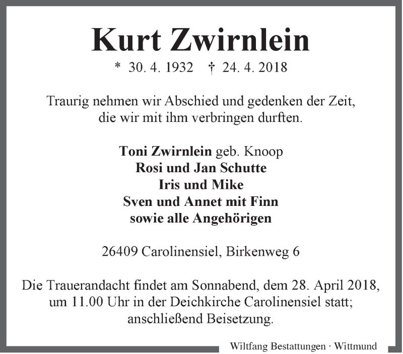 Zwirnlein, Kurt* 30.04.1932+ Carolinensiel 24.04.2018[] Carolinensiel 28.04.2018oo Toni KnoopCarolinensiel, Birkenweg 6 Kinder:Rosi Erstellt mit dem Programm AHNENBLATT (www.ahnenblatt.de).