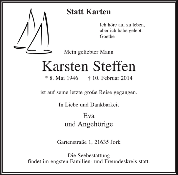 Steffen, Karsten* 08.05.1946+ 10.02.2014oo Eva ...Quelle: https://www.tageblatt-trauer.de/traueranzeige/karsten-steffen/37346162 Erstellt mit dem Programm AHNENBLATT (www.ahnenblatt.de).