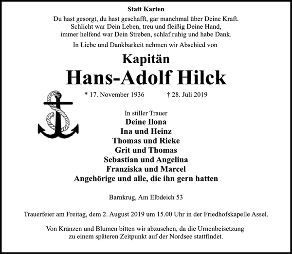 Hilck, Hans-AdolfKapitän* 17.11.1936+ Barnkrug, Stade 28.07.2019Quelle: https://www.tageblatt-trauer.de/traueranzeige/hans-adolf-hilck/55570978 Erstellt mit dem Programm AHNENBLATT (www.ahnenblatt.de).