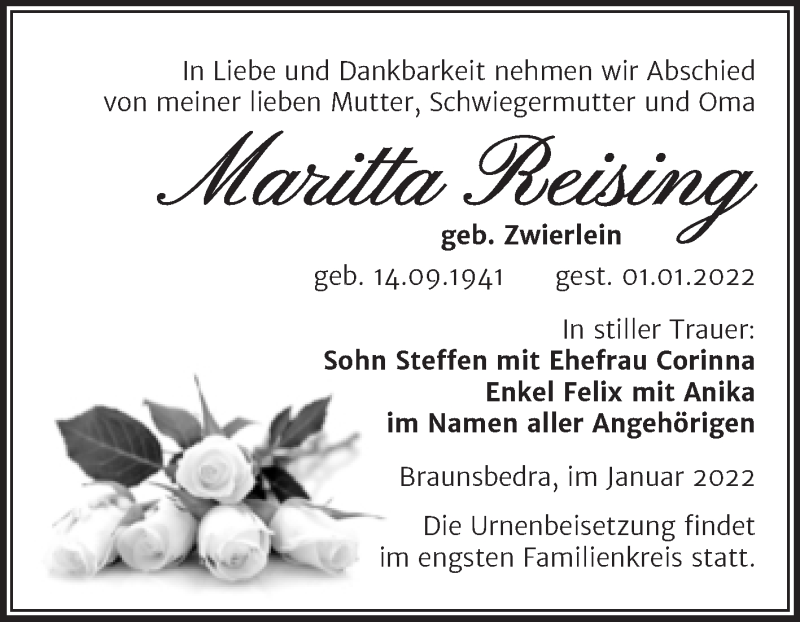 Zwierlein, Maritta* 14.09.1941+ Braunsbedra 01.01.2022oo ... Reising Kinder:Steffen Erstellt mit dem Programm AHNENBLATT (www.ahnenblatt.de).