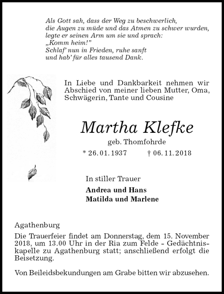 Thomforde, Martha* 26.01.1937+ Agathenburg 06.11.2018oo Adolf KlefkeQuelle: https://www.tageblatt-trauer.de/traueranzeige/martha-klefke/54397168 Kinder:Andrea Erstellt mit dem Programm AHNENBLATT (www.ahnenblatt.de).