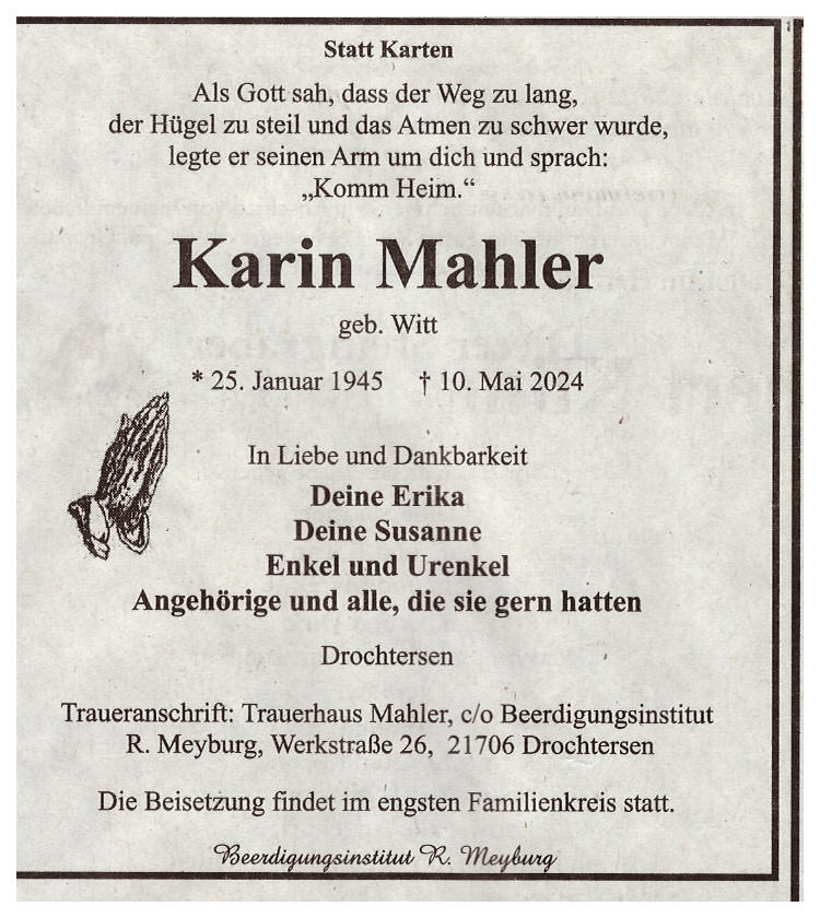Witt, Karin* 25.01.1945+ Drochtersen, Stade, Niedersachsen, Deutschland 10.05.2024oo ... MahlerQuelle: Traueranzeige Erstellt mit dem Programm AHNENBLATT (www.ahnenblatt.de).