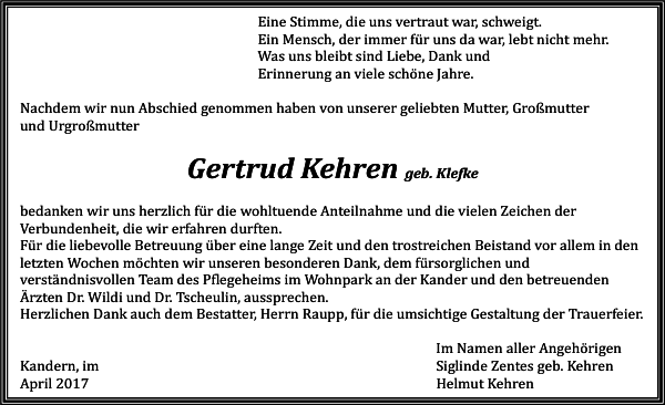Klefke, Gertrud+ 2017 Erstellt mit dem Programm AHNENBLATT (www.ahnenblatt.de).