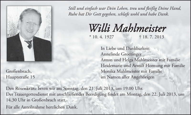 Mahlmeister, Willi* 10.04.1927+ Großenbrach, Bad Kissingen, Bayern, Germany 18.07.2013 Erstellt mit dem Programm AHNENBLATT (www.ahnenblatt.de).