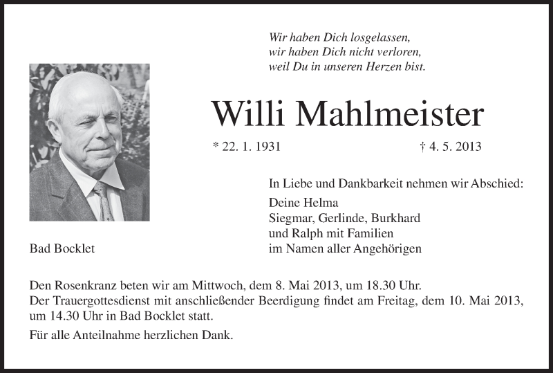 Mahlmeister, Willi* 22.01.1931+ Bad Bocklet, Aschach 04.05.2013oo Helma ... Erstellt mit dem Programm AHNENBLATT (www.ahnenblatt.de).
