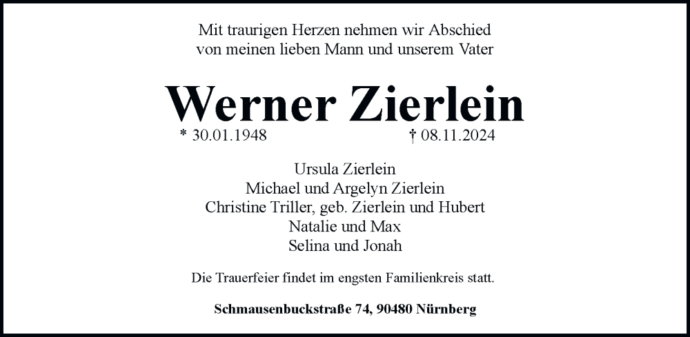 Zierlein, Werner* 30.01.1948+ 08.11.2024oo Ursula ...Quelle: https://www.trauer38.de/traueranzeige/werner-zierlein Kinder:Michael Christine Erstellt mit dem Programm AHNENBLATT (www.ahnenblatt.de).