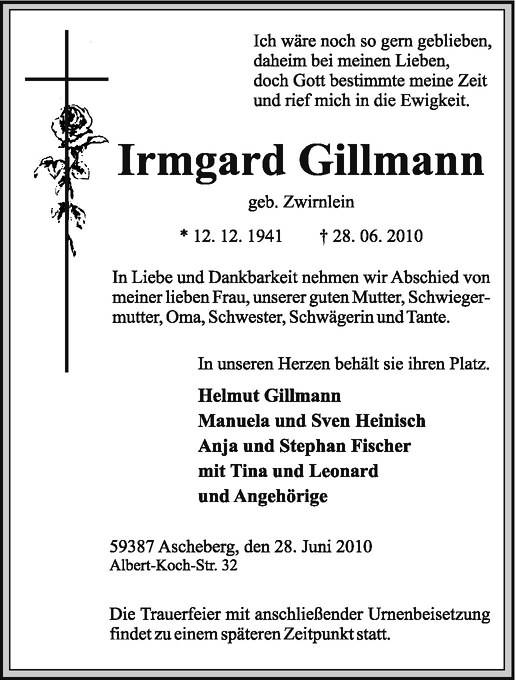 Zwirnlein, Irmgard* 12.12.1941+ Ascheberg, Coesfeld, Nordrhein-Westfalen 28.06.2010oo Helmut Gillmann59387 Ascheberg, Albert-Koch-Str. 32 Kinder:Anja Manuela Erstellt mit dem Programm AHNENBLATT (www.ahnenblatt.de).