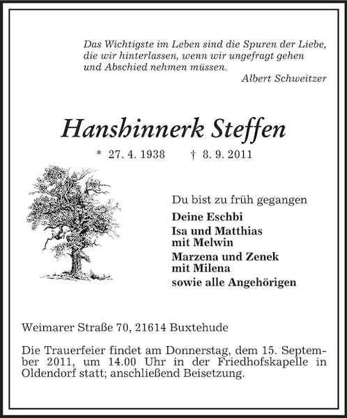 Steffen, Hanshinnerk* 27.04.1938+ 08.09.2011Quelle: https://www.tageblatt-trauer.de/traueranzeige/hanshinnerk-steffen/11424811 Erstellt mit dem Programm AHNENBLATT (www.ahnenblatt.de).