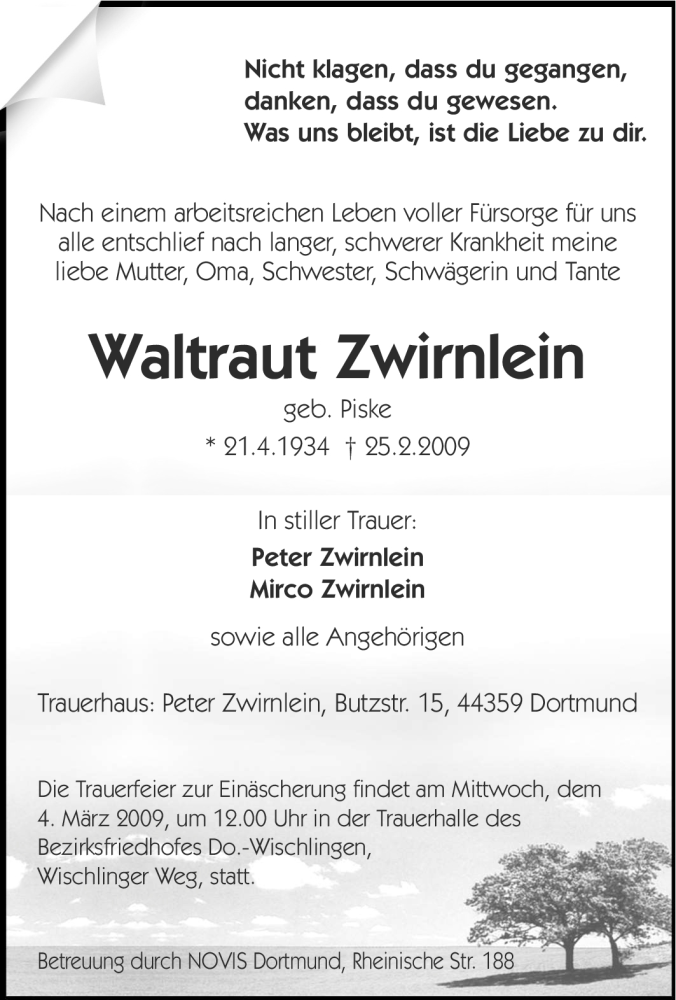 Piske, Waltraud* 21.04.1934+ Dortmund 25.02.2009oo ... Zwirnlein Kinder:Mirco Peter Erstellt mit dem Programm AHNENBLATT (www.ahnenblatt.de).