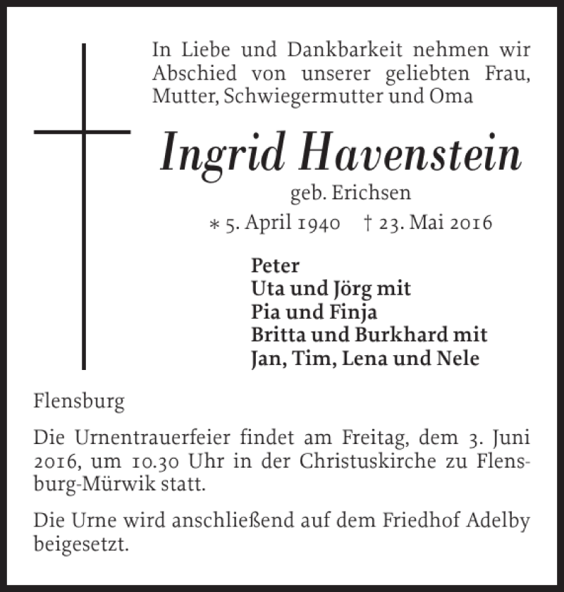 Erichsen, Ingrid* 05.04.1940+ 23.05.2016oo Peter HavensteinQuelle: Familie Vater:Jens Erichsen Mutter:Erna Lauer Geschwister:Heinz Kinder:Uta Britta Erstellt mit dem Programm AHNENBLATT (www.ahnenblatt.de).