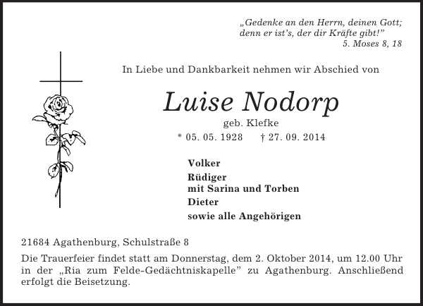 Klefke, Luise* 05.05.1928+ 27.09.2014o-o ...Quelle: https://www.tageblatt-trauer.de/traueranzeige/luise-nodorp/39210454 Kinder:Rüdiger Dieter Erstellt mit dem Programm AHNENBLATT (www.ahnenblatt.de).