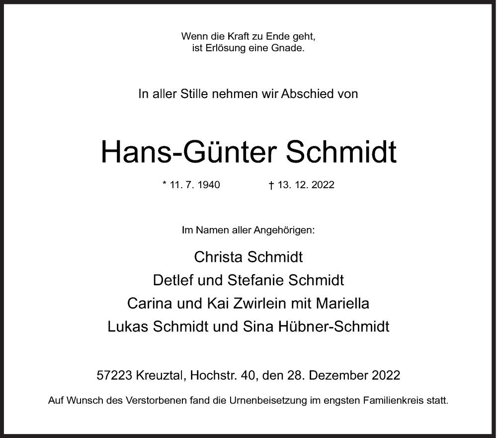 Schmidt, Hans-Günther* 11.07.1940+ Kreuztal 13.12.2022oo Christa ... Kinder:Carina Erstellt mit dem Programm AHNENBLATT (www.ahnenblatt.de).